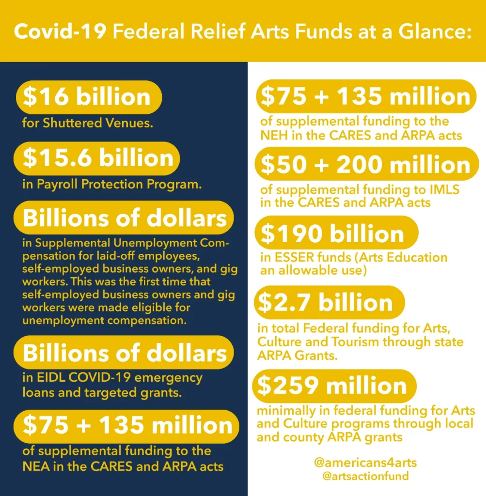 American for the Arts also worked with national, state, and local partners to identify that the National Endowment for the Arts (NEA) was best equipped to deliver federal funding quickly and efficiently to the arts community. This advocacy resulted in the NEA receiving $135 million through the American Rescue Plan Act (ARPA) “to prevent, prepare for, respond to, and recover from the coronavirus,” 40% of which was grants to state art agencies and regional arts organizations. A second NEA grant of more than $20 million was provided for subgranting by local agencies (by application) to distribute in their communities for saving and creating jobs, funding operations and facilities, health and safety supplies, and marketing and promotional efforts.