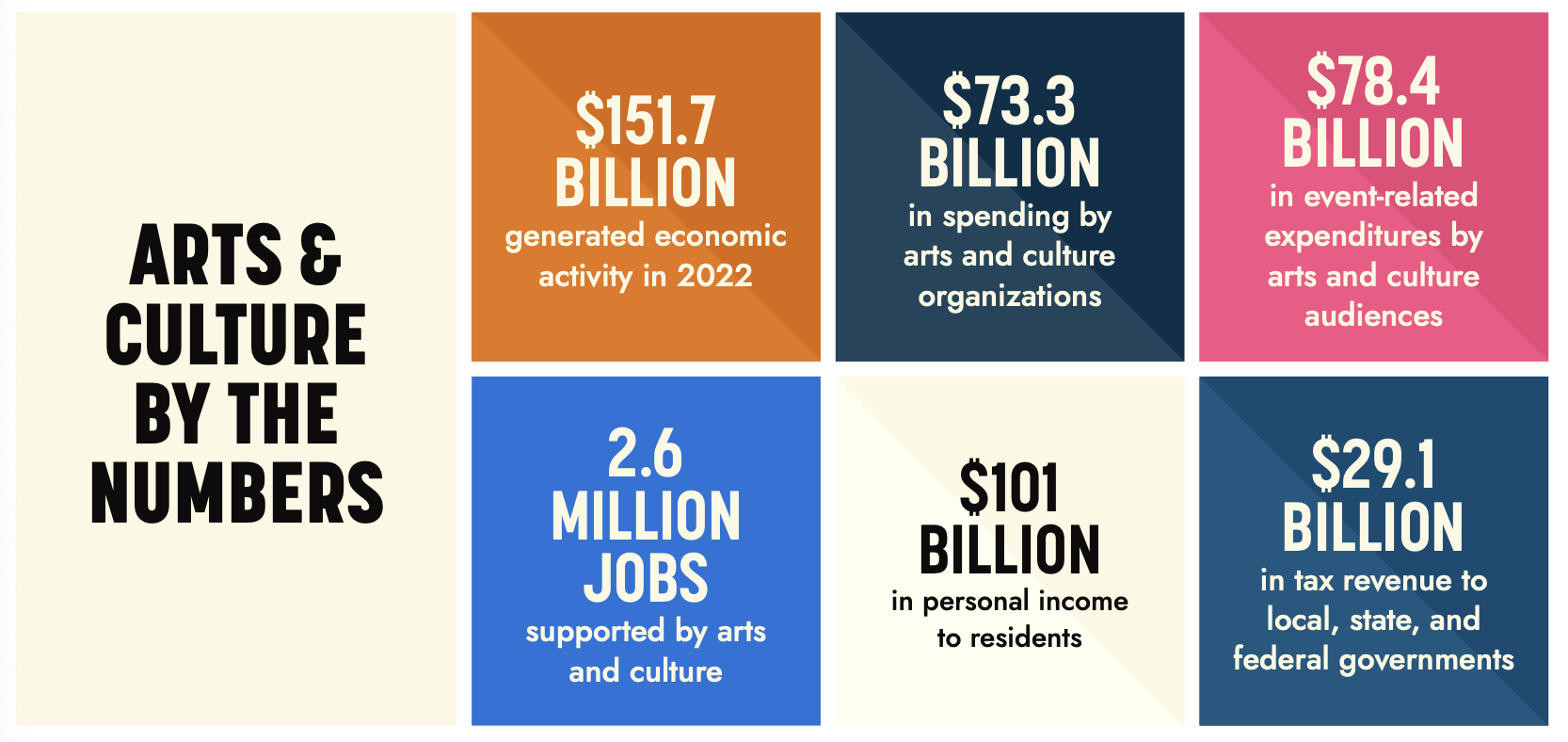 Arts & Economic Prosperity 6 (AEP6) is Americans for the Arts sixth national study on the economic impact of nonprofit arts and culture. Our findings from this signature study were released on October 12, 2023.